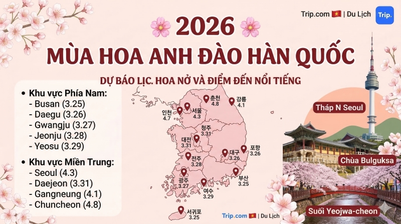 🌸 Thông báo thời gian hoa anh đào nở và các địa điểm nổi tiếng tại Hàn Quốc 2026
