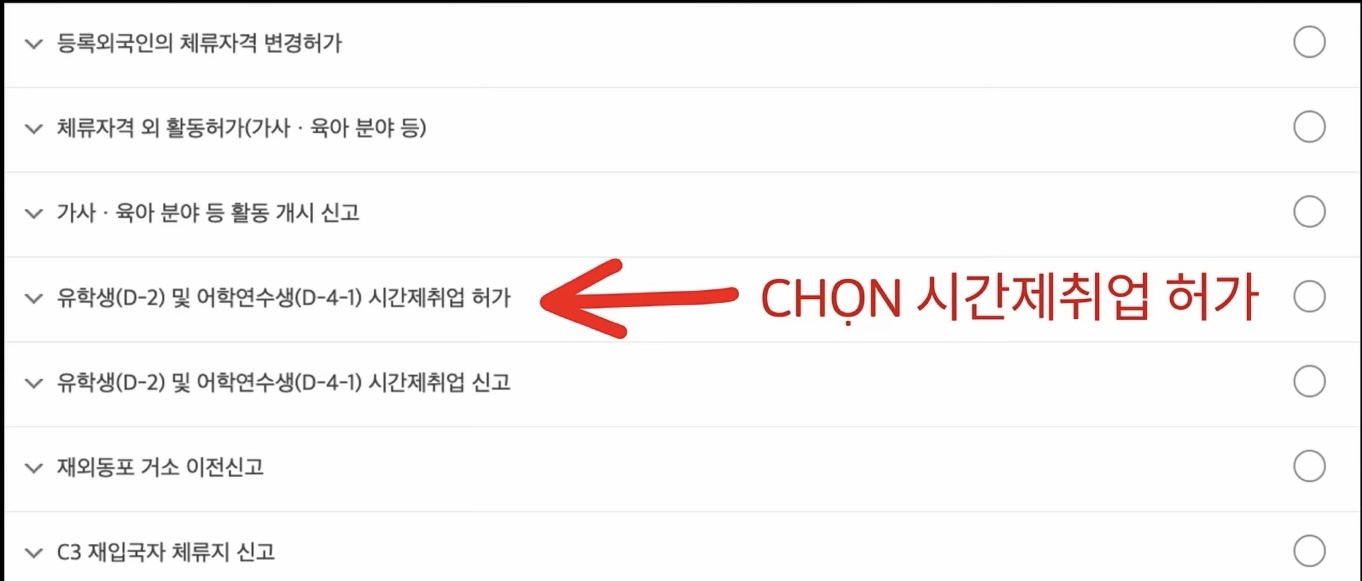 Chọn 유학생(D-2) 및 어학연수생(D-4-1) 시간제취업 허가