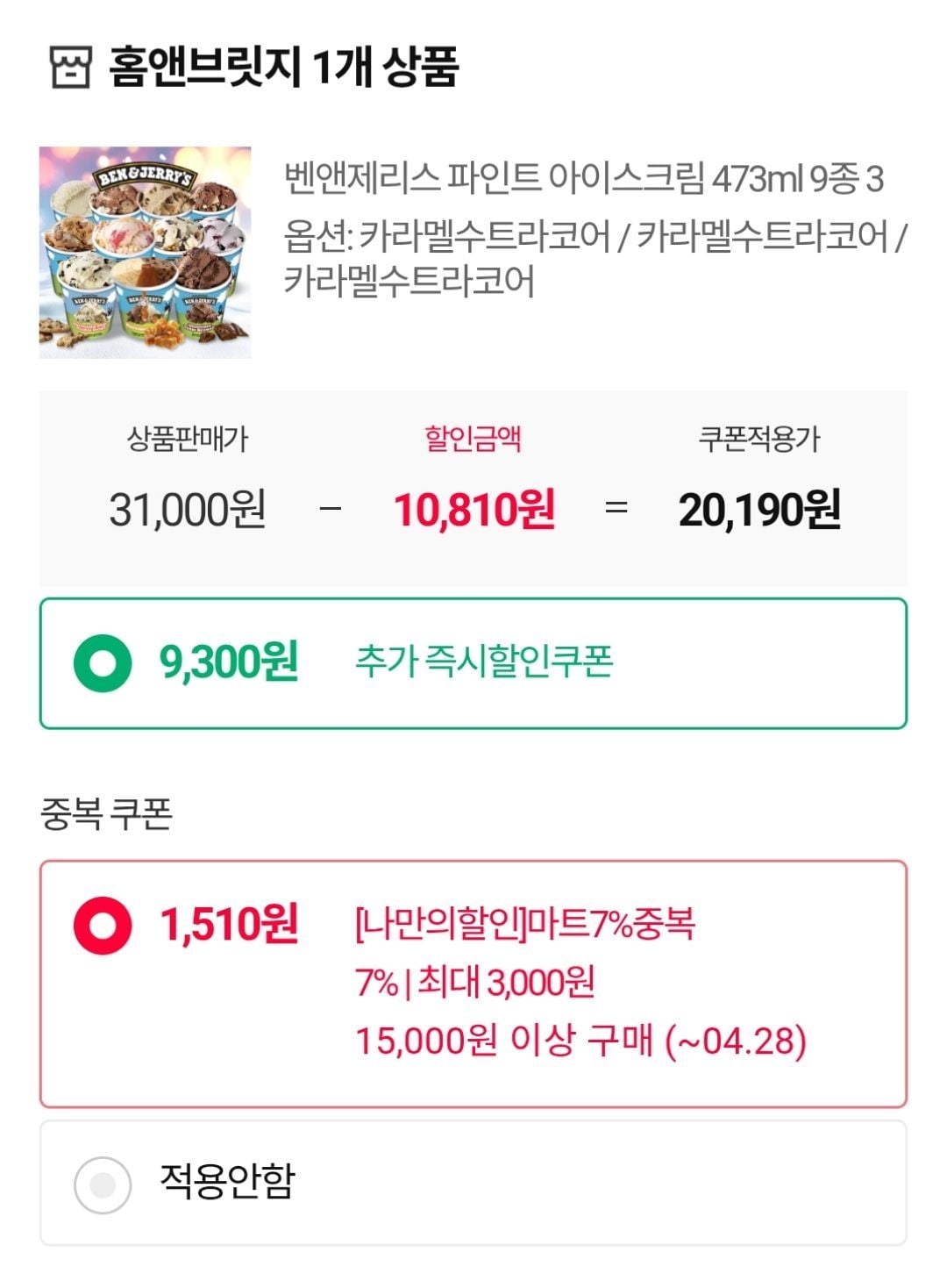 20.190 won trên 9 loại. Những phiếu xuất hiện là Caramel Sutra Core, Chunky Monkey, Vanilla và Phoebe More