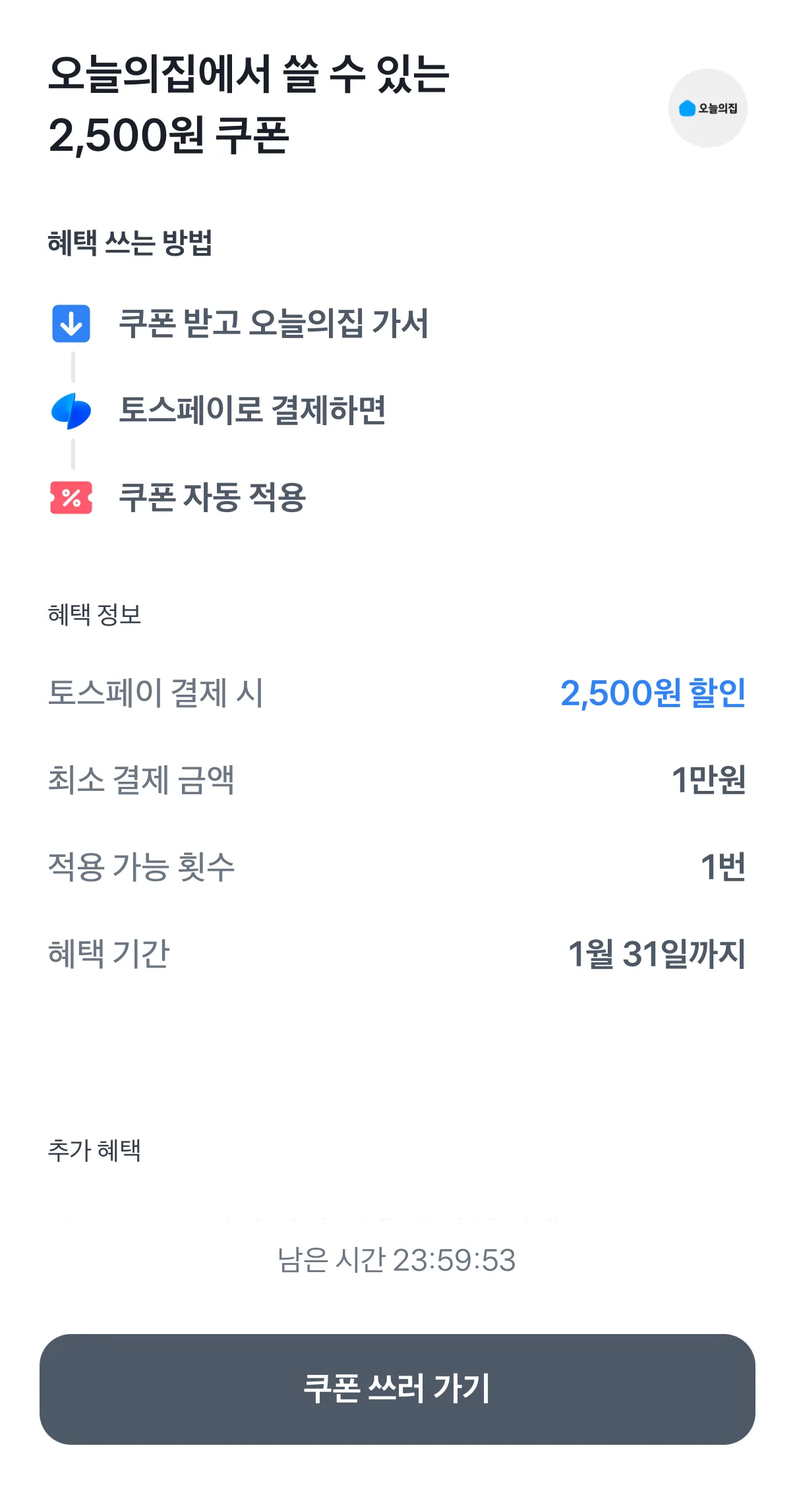 Chọn một tùy chọn và thanh toán bằng Toss > Toss Home > Phiếu giảm giá > Tìm kiếm Ngôi nhà hôm nay Nhận phiếu giảm giá 2.500 won ㄱㄱ