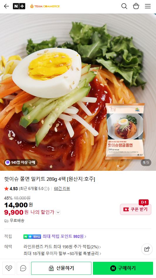 [Naver] Bộ đồ ăn Jjolmyeon phát hành hot 289g 4 gói 9,900 won