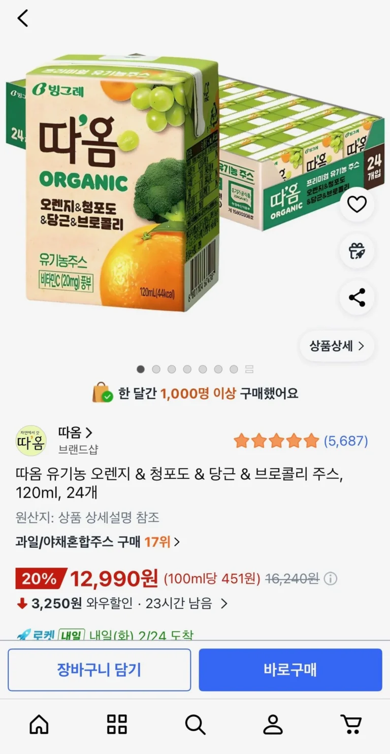 Nước ép cam & nho xanh & cà rốt & bông cải xanh hữu cơ Taom, 120ml, 24 miếng