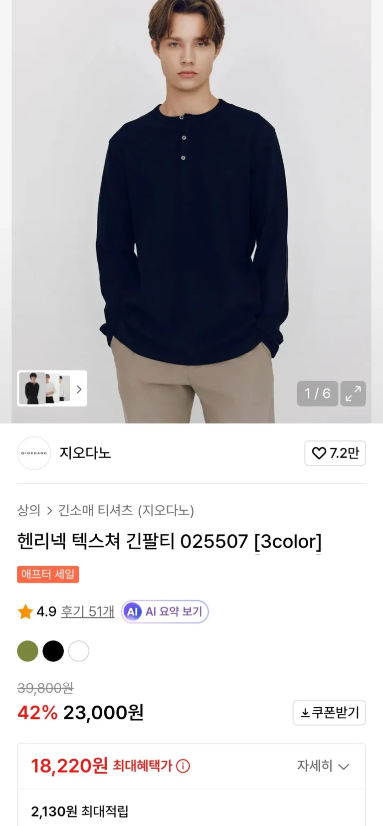 Áo thun dài tay họa tiết cổ Giordano Henry Màu ô liu/Đen/Trắng