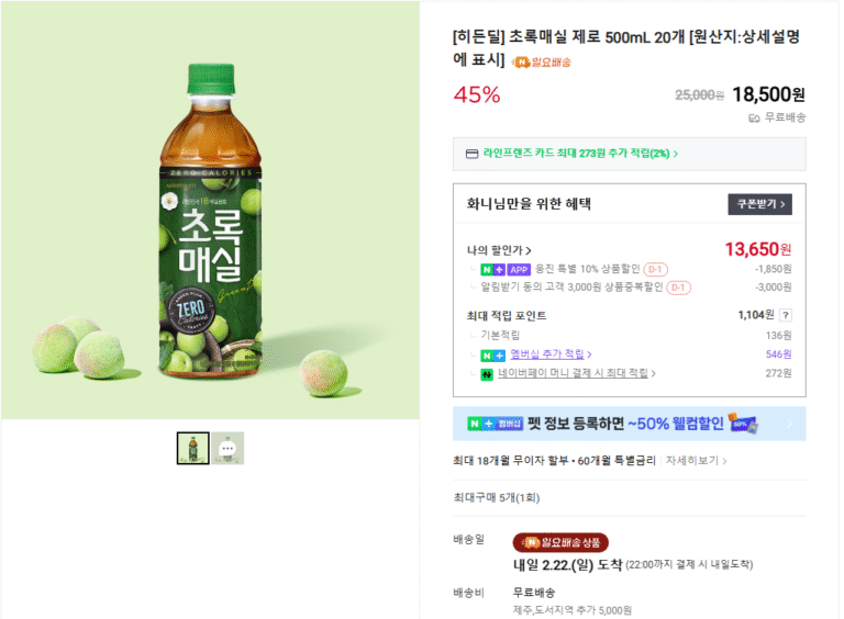 [Naver] 20 lon Green Plum Zero 500mL và 24 lon Sparkling Zero 350mL