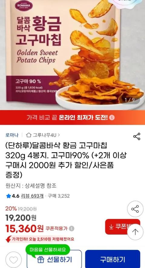 4 túi khoai tây chiên vàng giòn ngọt 320g (tổng cộng 1,28kg) + 5 bánh rán Yakgwa 40g mỗi túi