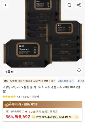[Ali] Trọng lượng cơ bản cao dày 63gsm Khăn lau ướt không gây dị ứng Breath Signature 70 tờ 10 gói (Coin Deal)