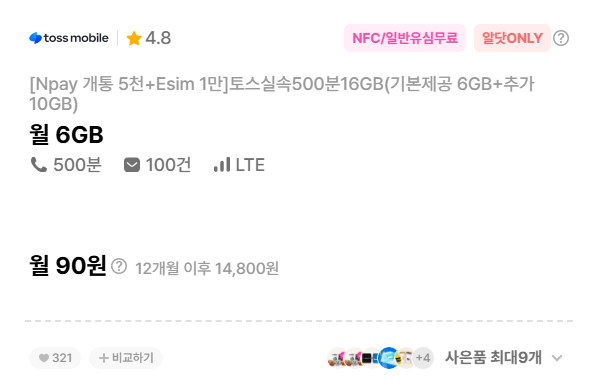 Toss Mobile 500 phút, 16GB, 90 won mỗi tháng (12 tháng)