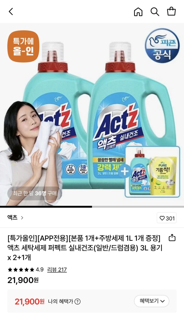 [Lotte On] Bột giặt Acts Perfect sấy khô trong nhà Thùng 3L, nước rửa chén 1L (21.900 KRW/tặng)
