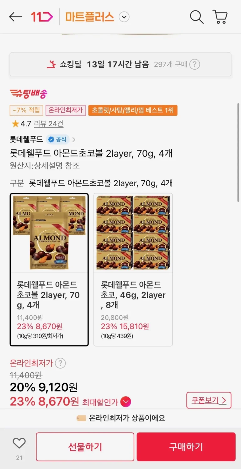 Viên sô cô la hạnh nhân Lotte Well Food 2 lớp, 70g, 4 miếng