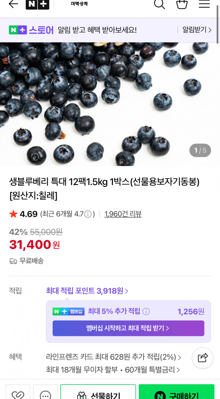 [Naver] Quả việt quất tươi Chile cực lớn 125g x 12 gói 31.400 won