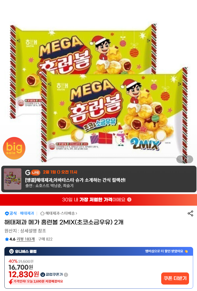 [G Market] Bánh kẹo Haitai ‘Mega’ Home Run Ball 2MIX Sô cô la & Sữa muối 2 chiếc (Tư cách thành viên)