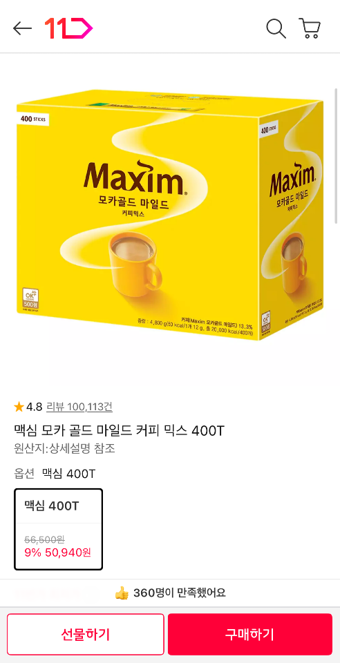 [11st] Cà phê pha chế Maxim Mocha Gold Mild 400T