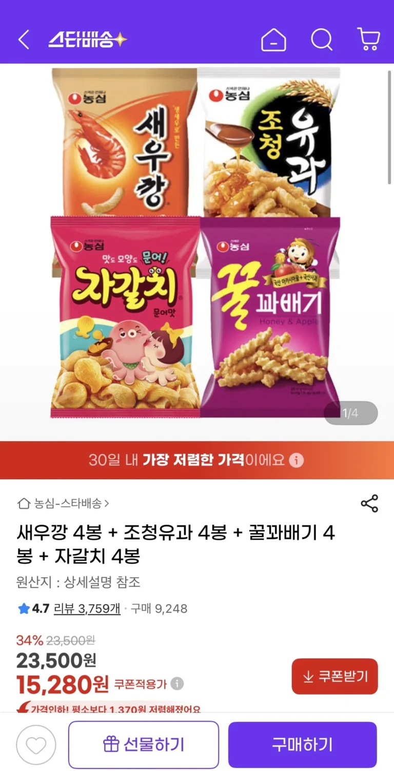 4 túi bánh phồng tôm + 4 túi siro ngũ cốc + 4 túi xoắn mật ong + 4 túi Jagalchi