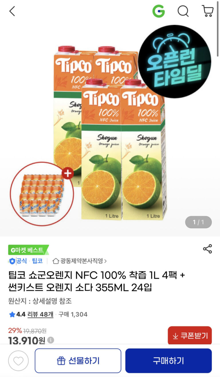 Tip Koshogun Cam NFC 100% Nước ép 1L 4 gói + Sunkist 24 miếng