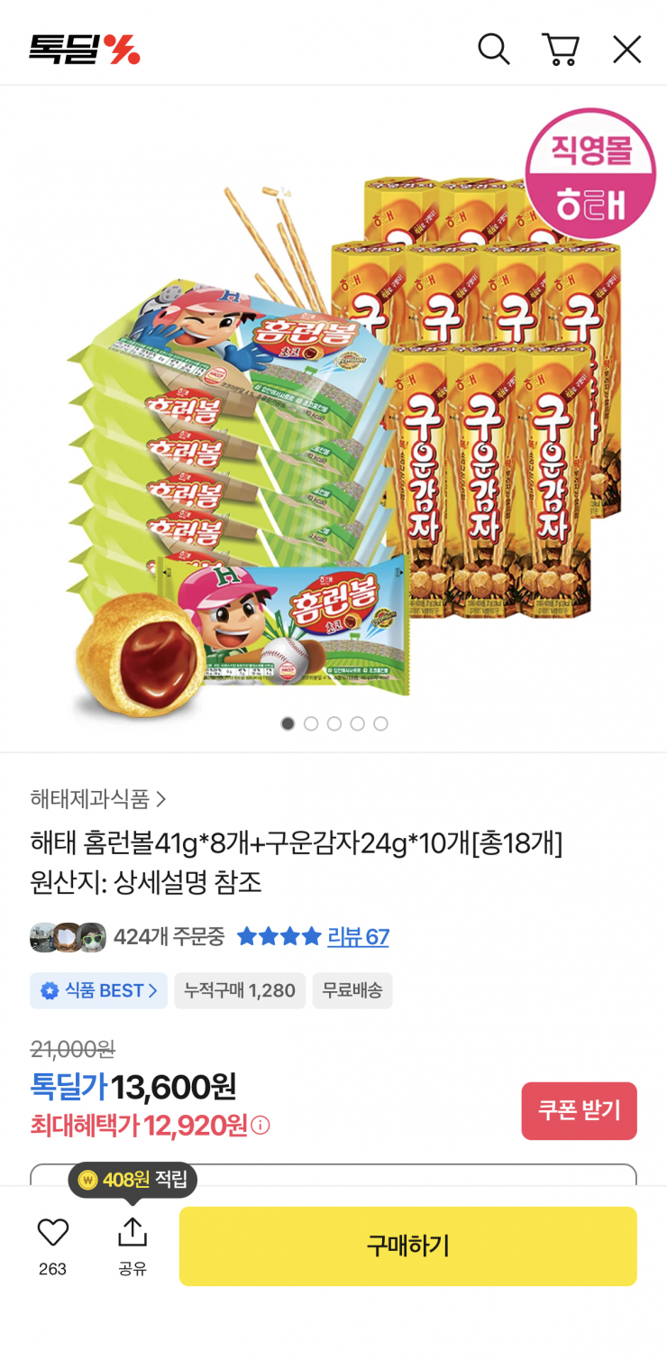 [Khác] 8 quả bóng home run Haitai + 10 củ khoai tây nướng (12.920 won/miễn phí)