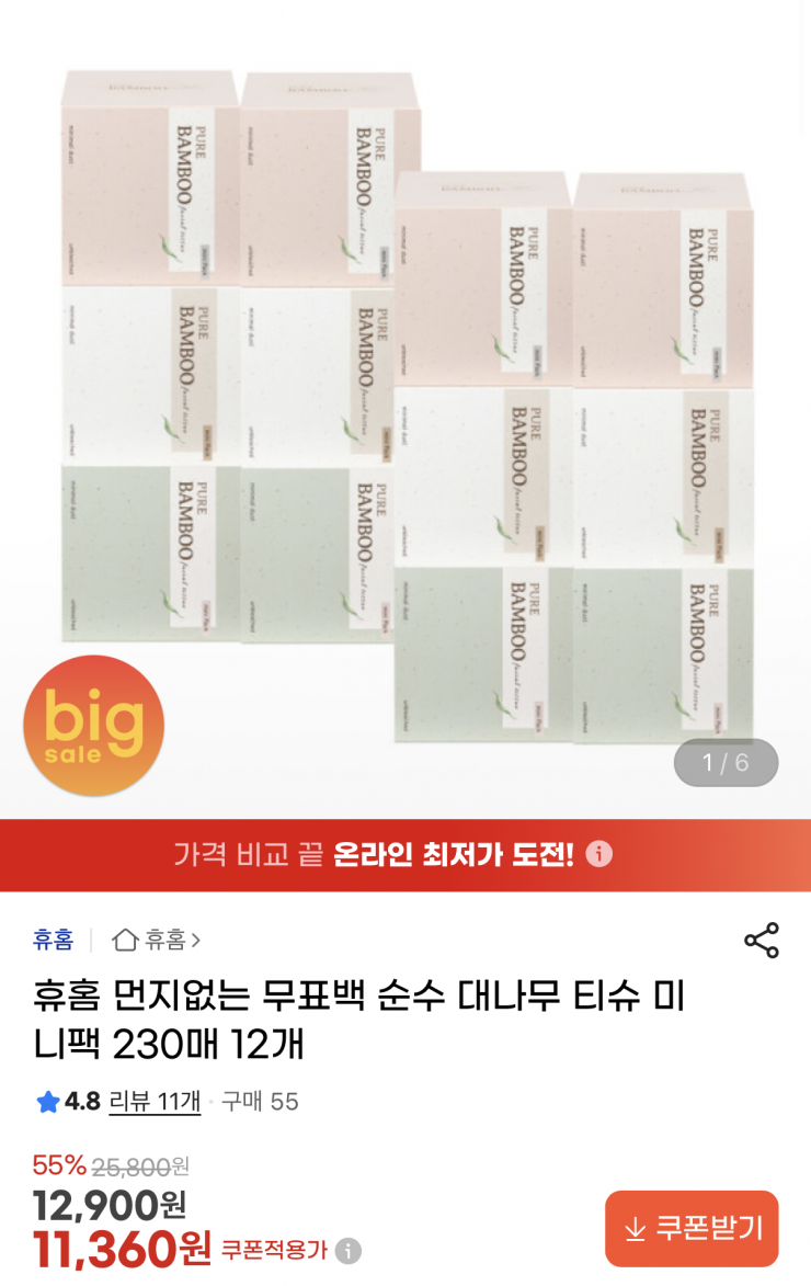 [G Market] Khăn giấy tre không tẩy trắng Huhome gói nhỏ 230 tờ x 12 (11.360 KRW/tặng)