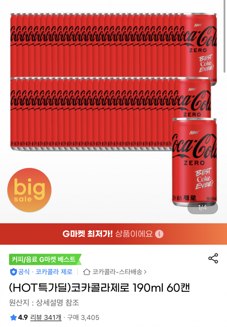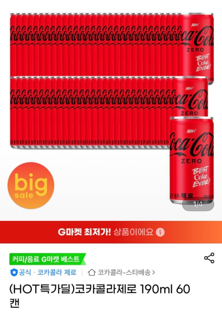 [G Market] 60 lon Coca-Cola Zero 190ml (23.940 KRW/tặng)