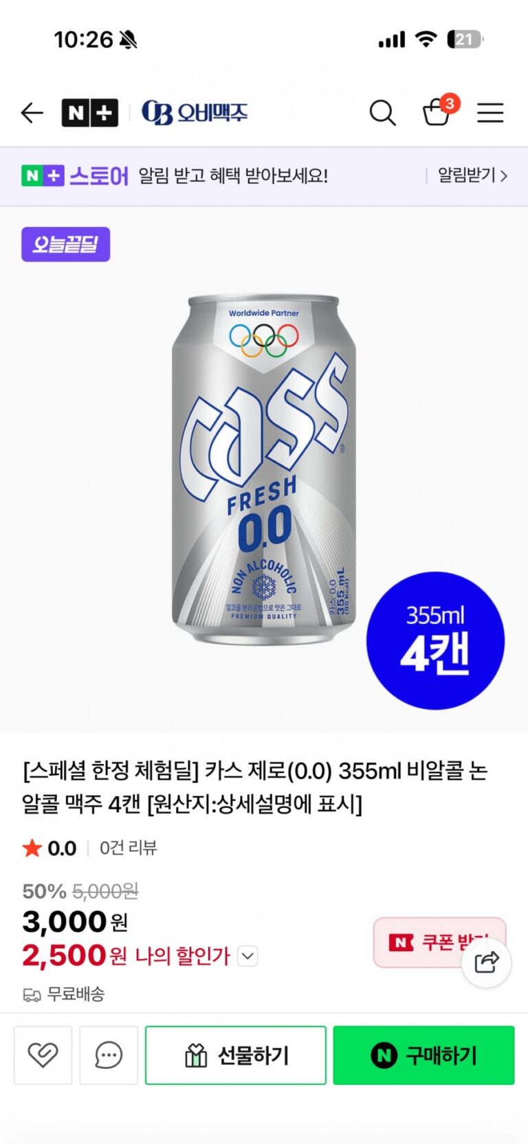 4 lon bia không cồn Cass Zero 355ml