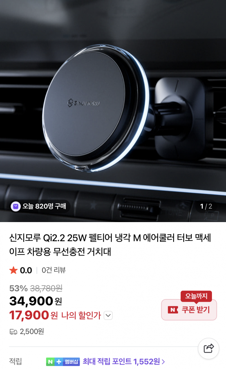[Naver] Đế sạc không dây trên ô tô Sinjimoru Qi2.2 25W MagSafe (17.900 KRW/Trả phí)