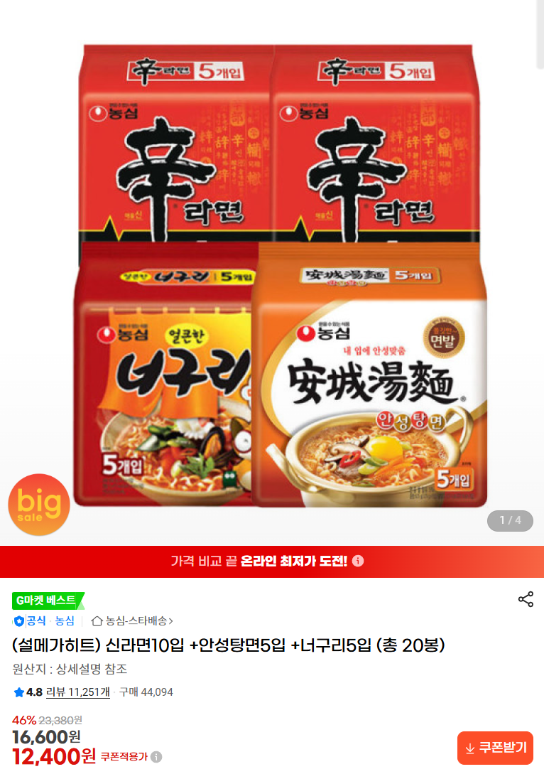 [Naver] Nongshim Shin Ramyun 120g x 20 túi (tư cách thành viên)