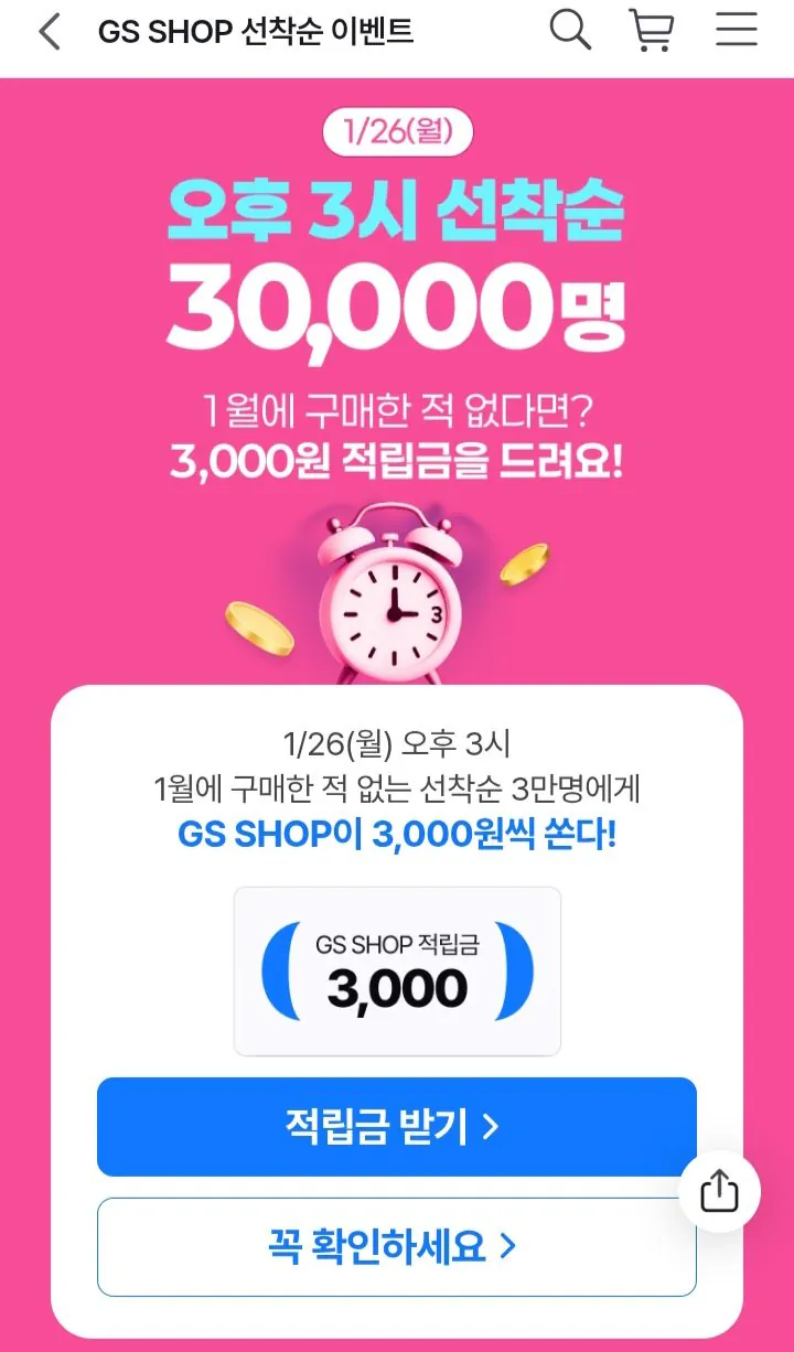(Chỉ ứng dụng) Điểm dành cho người không mua hàng trong tháng 1: 3.000 won, đến trước, phục vụ trước, 30.000 người, 3 giờ chiều.