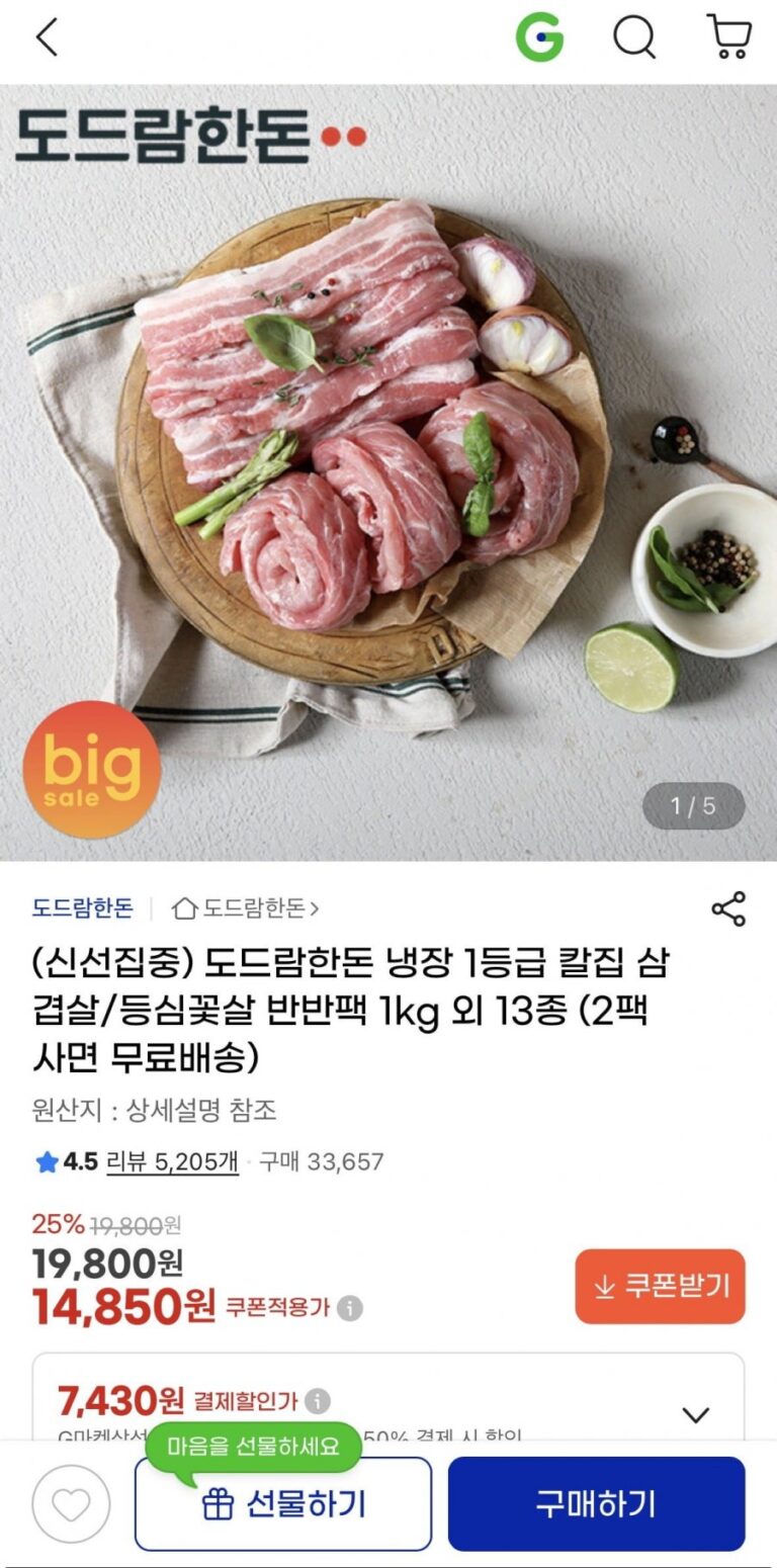 Dodeuram Handon Thịt ba chỉ đông lạnh Bụng / Thịt chân trước Nửa và Nửa gói 1kg