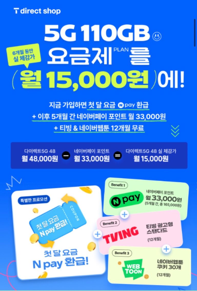 SK 5G 110GB + 5Mbps Hoàn trả toàn bộ phí tháng đầu tiên + TV miễn phí + sự kiện bổ sung 10.000 > Đã thực hiện 15.000 won