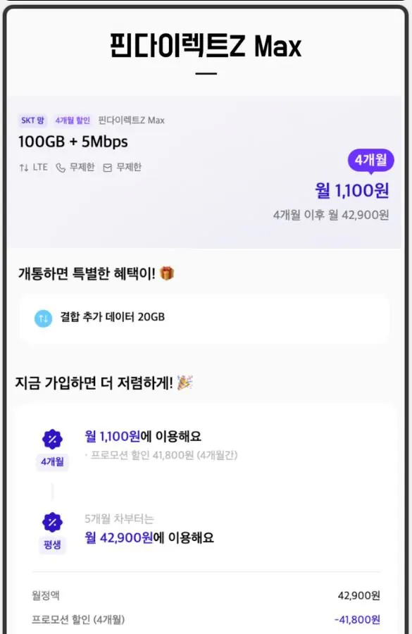 Mạng SKT 100GB+5Mbps 4 tháng 1.100 won mỗi tháng