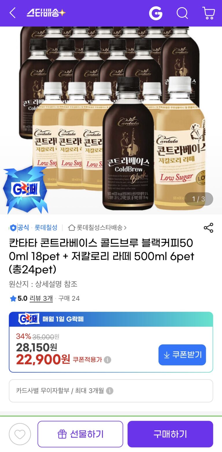 [G Market] Cantata Contrabass Black 500 Pet 18 gói + 6 gói Latte (22.900 KRW/tặng)