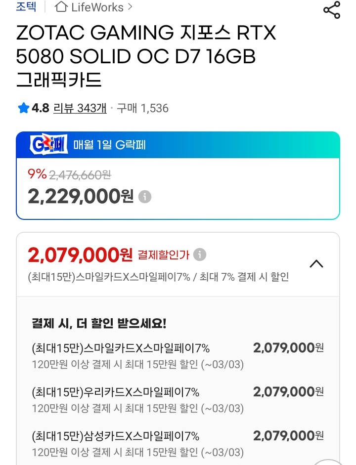 [GMarket] Card đồ họa ZOTAC GAMING GeForce RTX 5080 SOLID OC D7 16GB