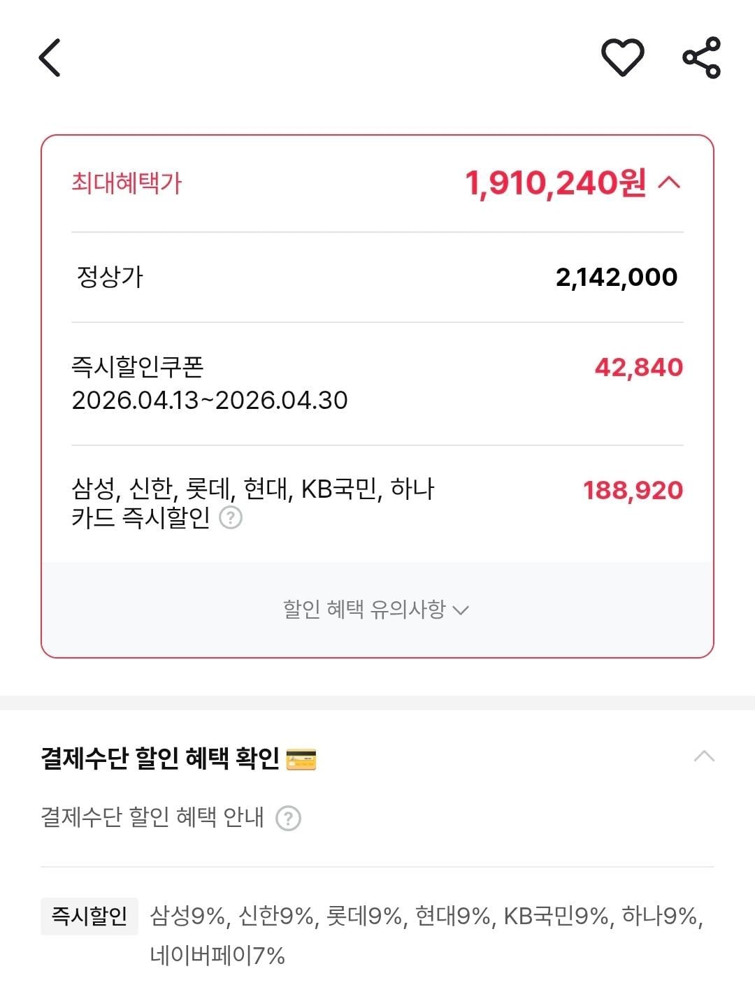Giá chiết khấu thẻ 1.910.240 won (Samsung/Shinhan/Lotte/Hyundai/KB/Hana)