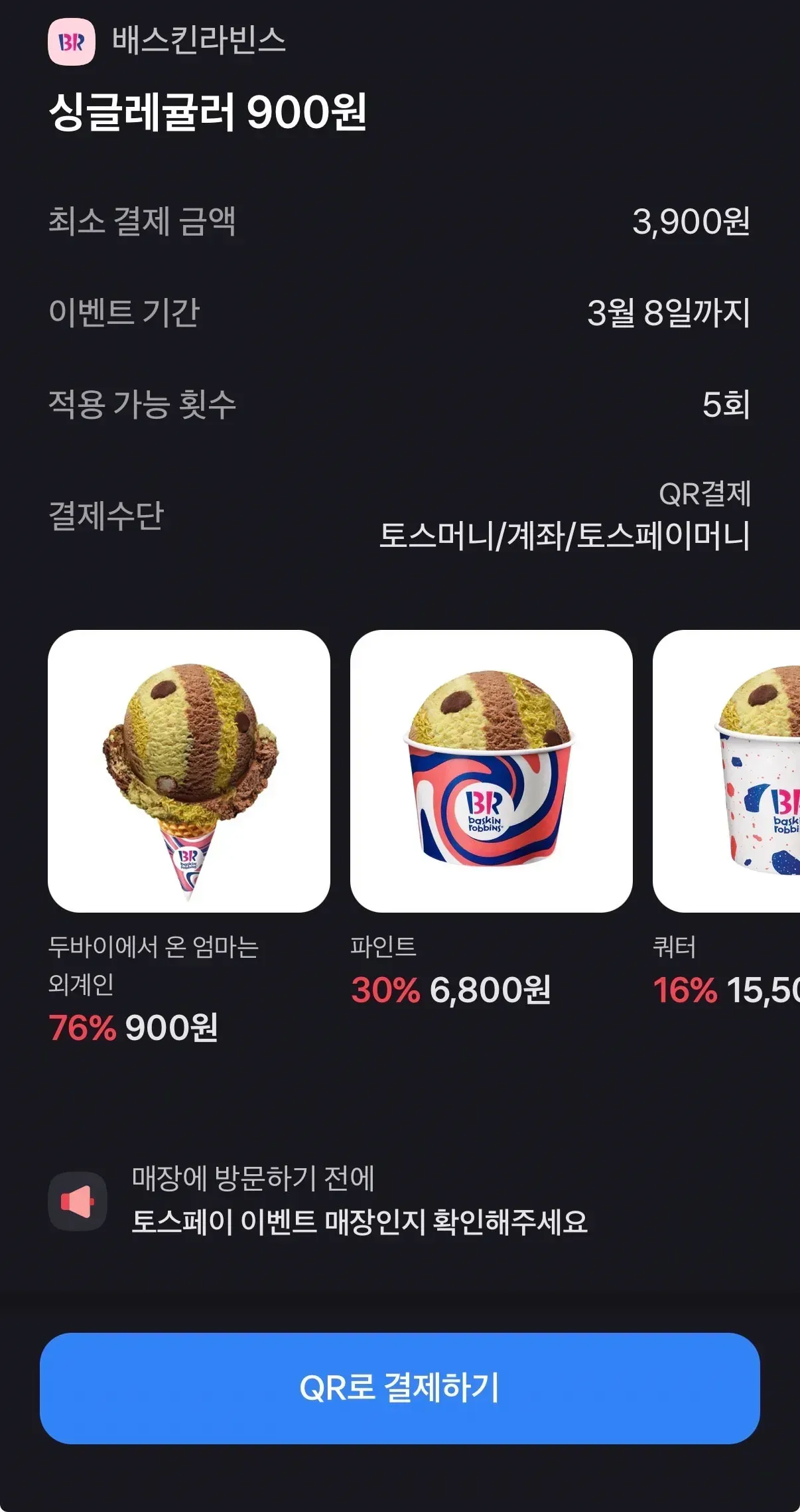 Thanh toán QR 900 won khi thanh toán ngoại tuyến tại cửa hàng Bara Single Regular