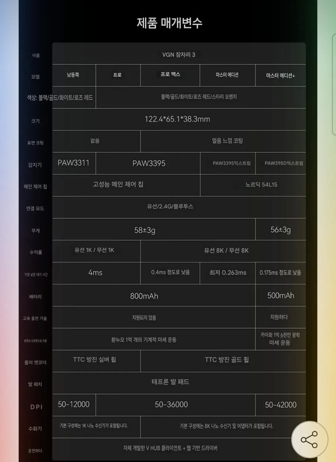 Tính năngCải thiện độ lệch khi nhấp chuột (dễ dàng cầm trên tay hơn)Hỗ trợ Bluetooth có dây/không dây 3 chế độCó dây/không dây 8kNordic 54LBộ khung bên trong được tăng cường3395 ExtremeSự khác biệt so với phiên bản cao nhất, Master+ làCông tắc cơ, không hỗ trợ sạc nhanh, dung lượng pinmột chút lớn hơnTương tự Chưa tìm thấy vỏ