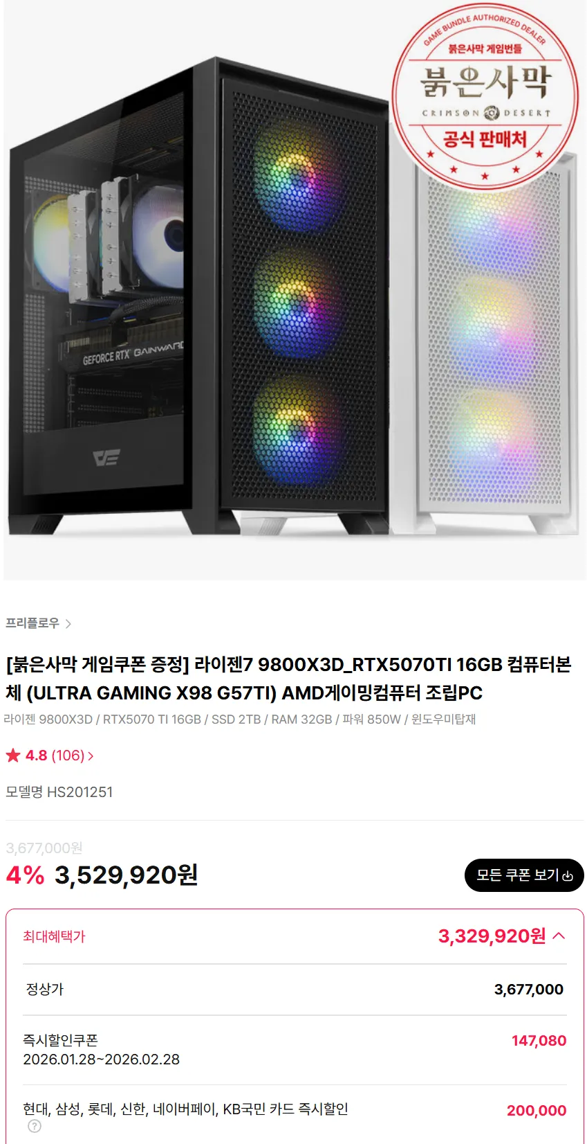 Gói CPU Red DesertGói GPU Resident Evil Requiem Quà tặngNếu bạn mua bo mạch chủ và đăng ký trong vòng 2 tuần, chế độ bảo hành sẽ là kéo dài từ 1 năm đến 4 năm, ngoài ra còn có sự kiện review Nefe trị giá 10.000 won.
