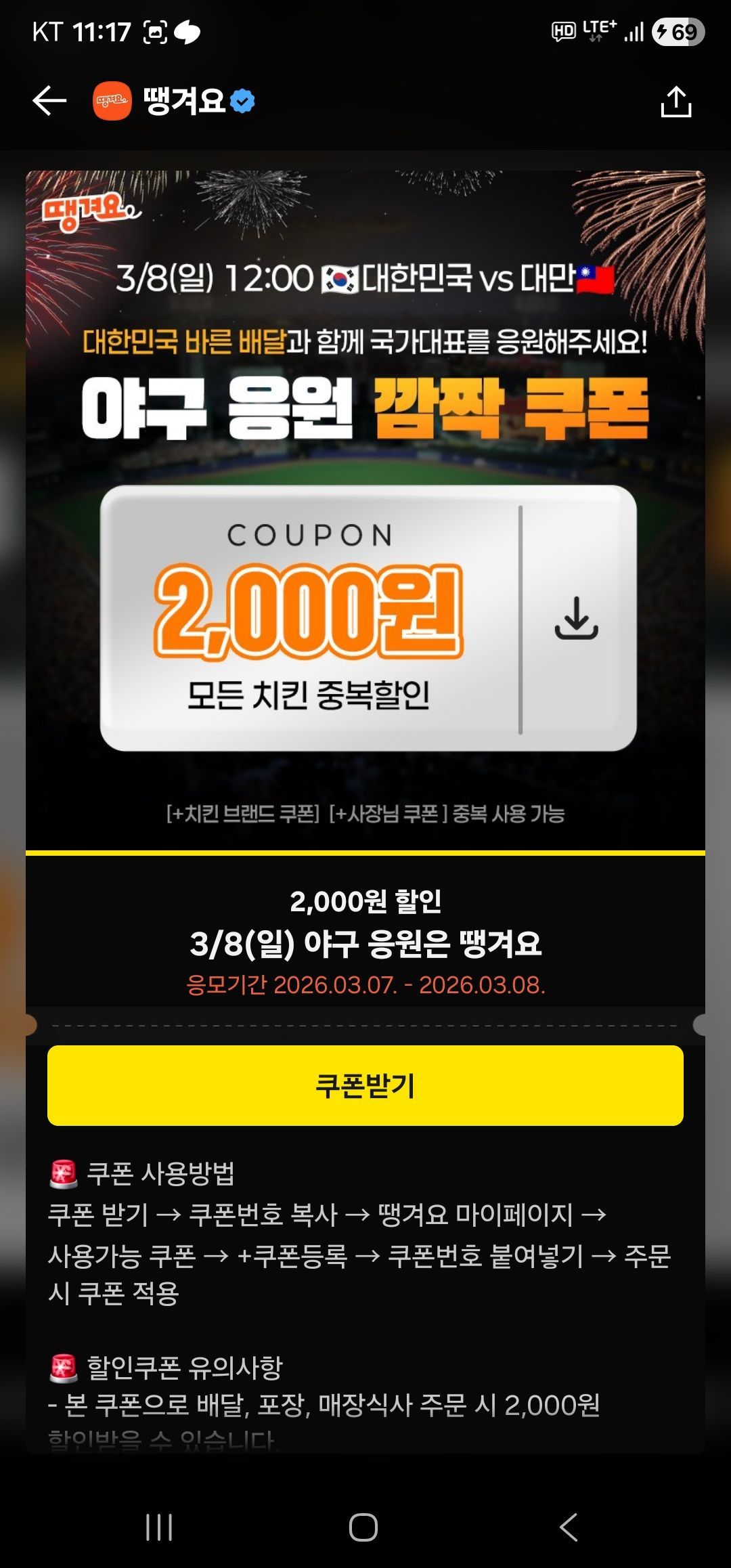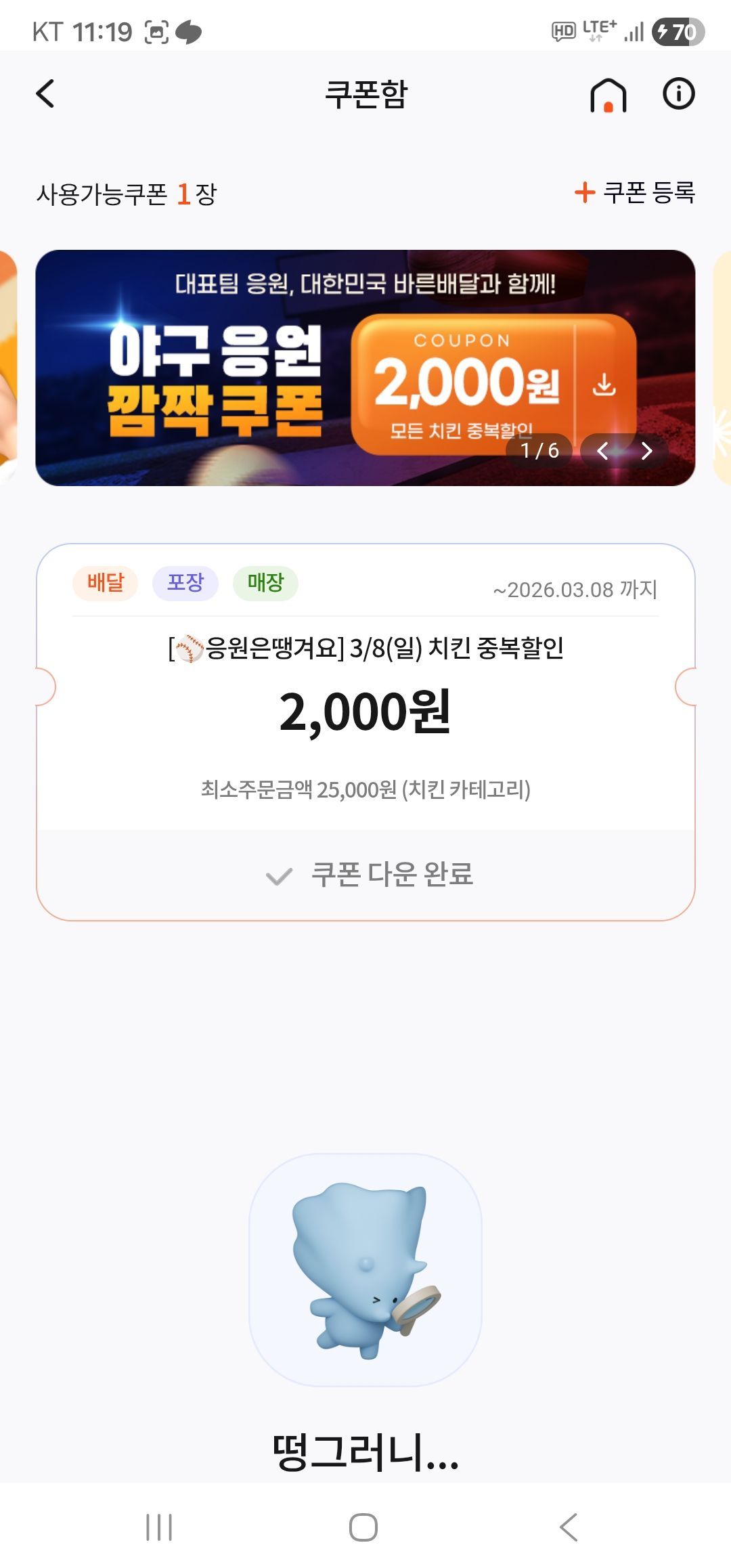 Đơn hàng trên 25.000 won Si Bạn có thể áp dụng số tiền chiết khấu + 2.000 won cho thực đơn gà hiện đang được giảm giá trong tab sự kiện