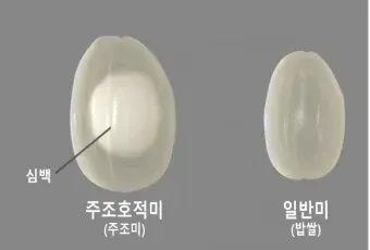 저 안쪽의 하얀 부분이 심백(心白)인데 통상 일반 밥쌀에선 거의 찾아볼 수 없는걸 확인할 수 있는데