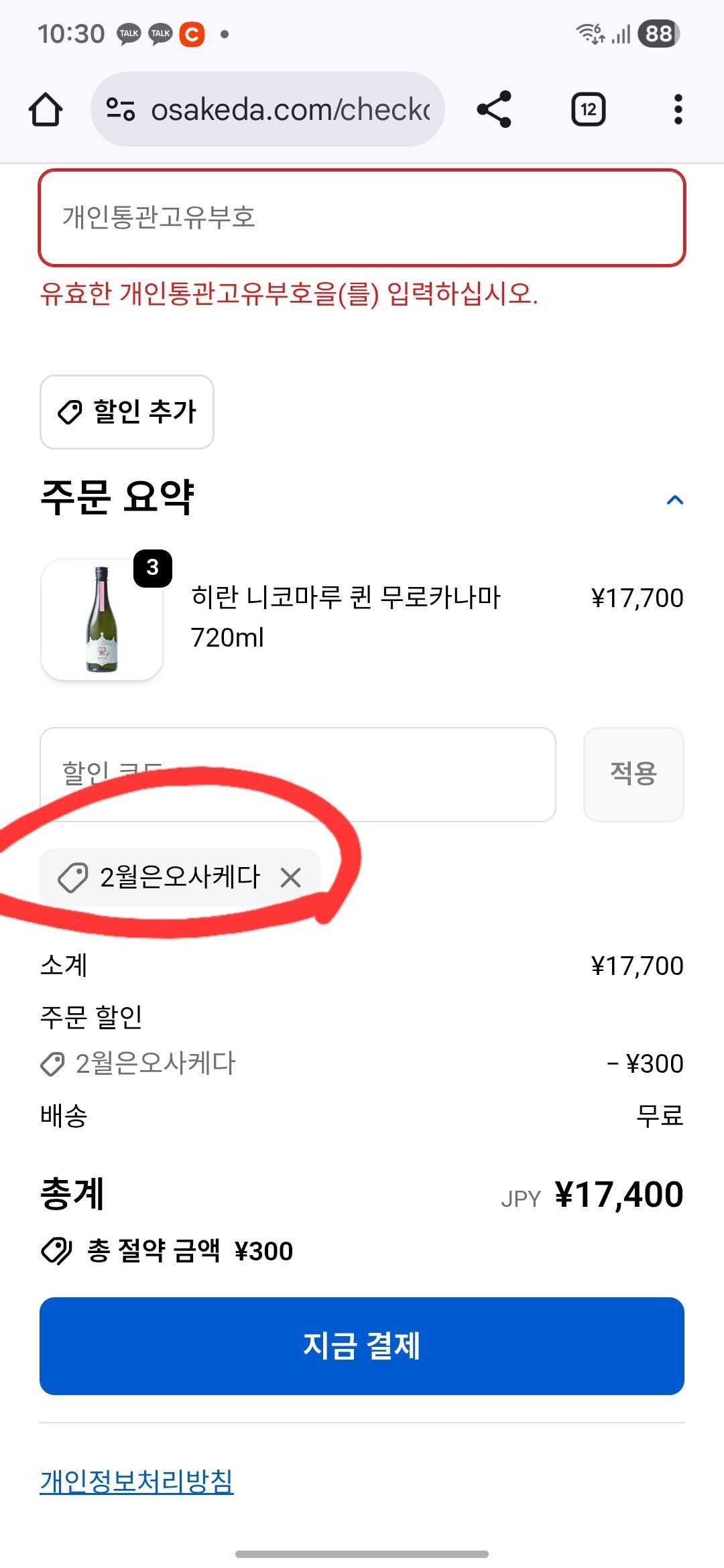 주문 시 ‘2월은오사케다’할인쿠폰탭에 입력하면 300엔 할인(1회용) 최종가 5600엔