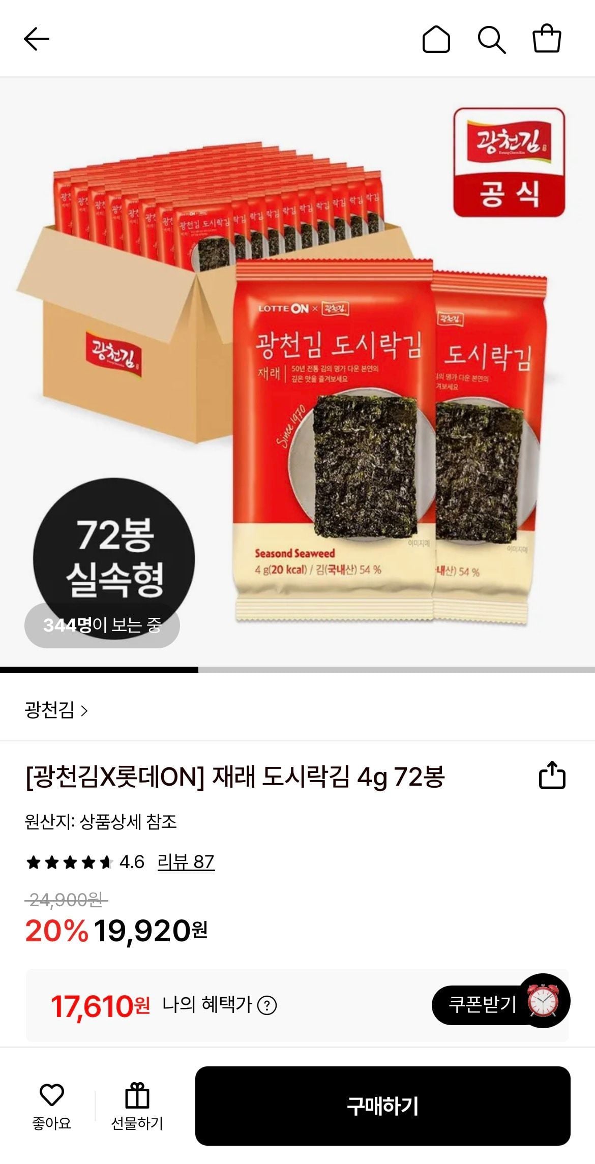 Hộp cơm trưa truyền thống rong biển Gwangcheon rong biển 4g 72 túi