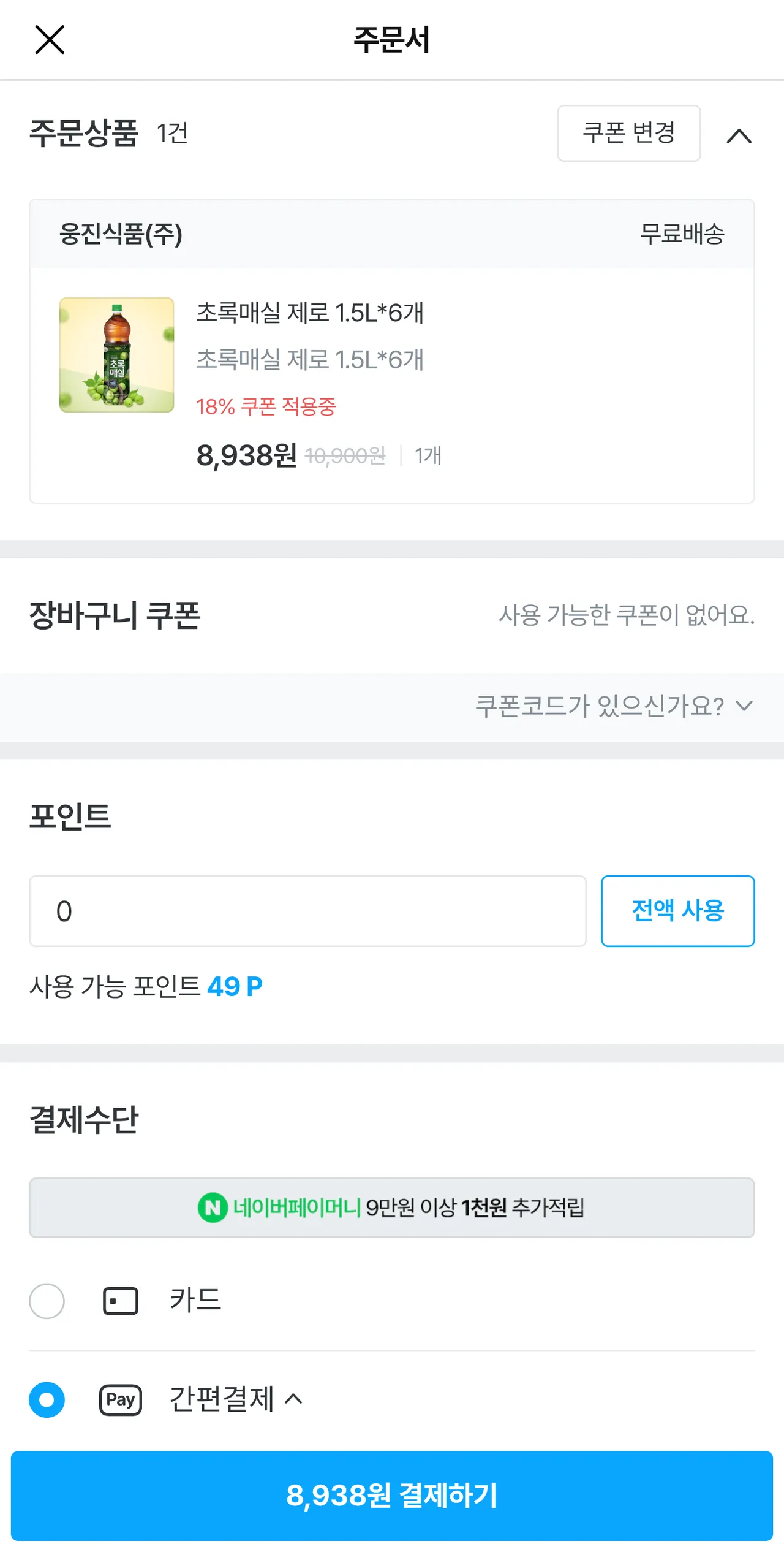 Chỉ cần đi lấy phiếu giảm giá 18% của Woongjin FoodsTôi còn 2 chai và đổ đầy 6 chai
