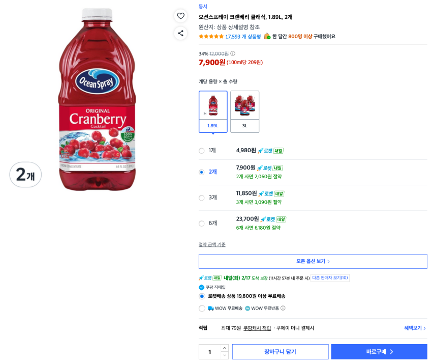 Ocean Spray Cranberry Classic, 1.89L, 2 chiếc