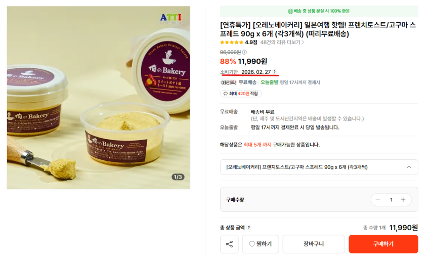 3 Bánh mì nướng bơ phết vị bơMiếng phết hương vị khoai lang 3Tổng cộng 6 cái 12.000 won Ngày hết hạn đến ngày 27 tháng 2