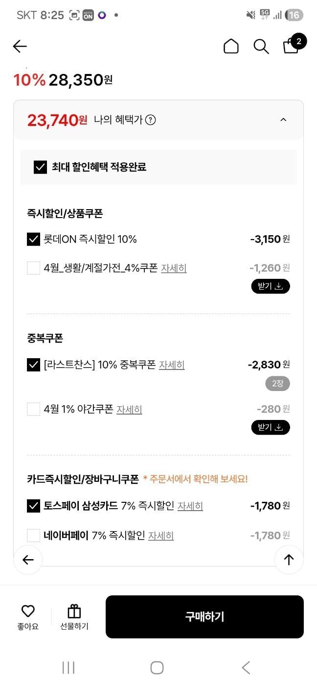 Giảm giá ngay lập tức 10% / 10% cơ hội cuối cùng / Bạn có thể nhận thêm 7% nếu thanh toán bằng Tos Pay hoặc Naver Pay.