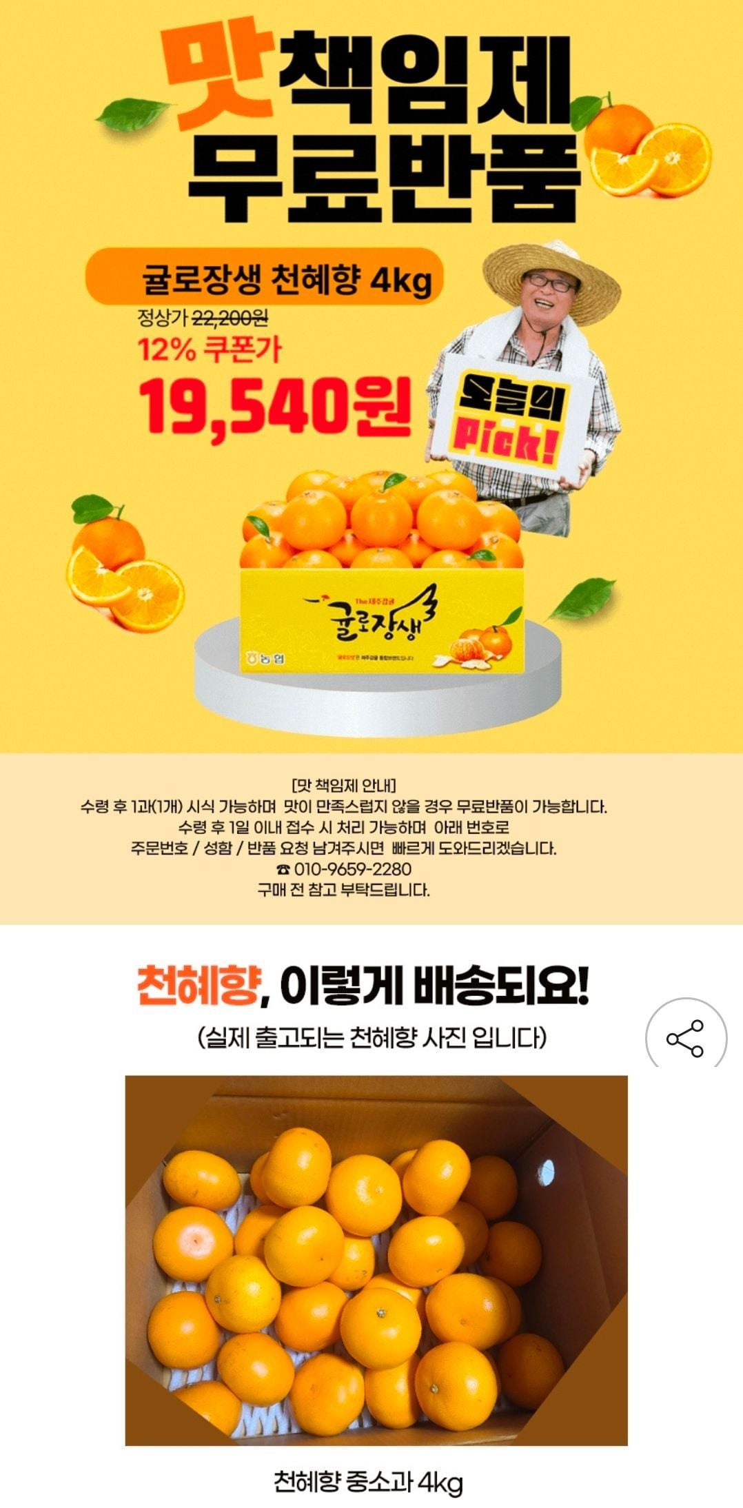 맛 책임제라서 한개 먹고 맘에 안들면 무료 반품 된다고 함 ㄷ제주농협 브랜드에 당도 13브릭스 보장까지 있어서 사실상 뭐 맛없어서 돈버릴 일은 없는듯천혜향 좋아하면 좀 싸게 사서 주변에 돌리고 질리도록 까먹을 수 있겠다 ㅋㅋ