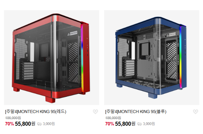 상품명: MONTECH KING95 (블루) 할인 전 금액: 186,000원할인 후 금액: 55,800원구매 링크: https://smartstore.naver.com/nosecare/products/13331574112상품명: MONTECH KING95 (레드) 할인 전 금액: 186,000원할인 후 금액: 55,800원구매 링크: https://smartstore.naver.com/nosecare/products/13331584085상품명: MONTECH KING95 (블랙)할인 전 금액: 162,000원할인 후 금액: 81,000원구매 링크: https://smartstore.naver.com/nosecare/products/13331551560상품명: MONTECH HS02 PRO BTF (블랙)할인 전 금액: 149,000원할인 후 금액: 89,400원구매 링크: https://smartstore.naver.com/nosecare/products/13331596390상품명: MONTECH HS02 PRO BTF (화이트)할인 전 금액: 154,000원할인 후 금액: 92,400원구매 링크: https://smartstore.naver.com/nosecare/products/13331599813상품명: MONTECH CENTURY II 850W할인 전 금액: 114,000원할인 후 금액: 91,200원구매 링크: https://smartstore.naver.com/nosecare/products/13364442784상품명: MONTECH CENTURY II 1050W할인 전 금액: 154,000원할인 후 금액: 115,500원구매 링크: https://smartstore.naver.com/nosecare/products/13364446373상품명: MONTECH CENTURY II 1200W할인 전 금액: 199,000원할인 후 금액: 149,250원구매 링크: https://smartstore.naver.com/nosecare/products/13364463821상품명: MONTECH TITAN PLA 1000W 플래티넘 ATX3.1 (화이트)할인 전 금액: 239,000원할인 후 금액: 191,200원구매 링크: https://smartstore.naver.com/nosecare/products/13331048124상품명: MONTECH TITAN PLA 1200W 플래티넘 ATX3.1 (화이트)할인 전 금액: 279,000원할인 후 금액: 223,200원구매 링크: https://smartstore.naver.com/nosecare/products/13331059765상품명: SuperFlower SF-850F14GE LEADEX III GOLD UP ATX3.1할인 전 금액: 164,000원할인 후 금액: 139,400원구매 링크: https://smartstore.naver.com/nosecare/products/13331611304상품명: TRYX STAGE ARGB 360 (블랙)추가 혜택:  랜덤 피규어 추가 증정할인 전 금액: 344,000원할인 후 금액: 275,200원구매 링크: https://smartstore.naver.com/nosecare/products/13330750930상품명: TRYX STAGE ARGB 360 (화이트)추가 혜택:  랜덤 피규어 추가 증정할인 전 금액: 344,000원할인 후 금액: 275,200원구매 링크: https://smartstore.naver.com/nosecare/products/13330761455케이스, 파워, 쿨러 등등 잡다하게 다 팜 스테이지 쿨러는 구매 시 랜덤 피규어 주는데 미쿠랑 애니 캐릭터 등등 다양하게 있더라