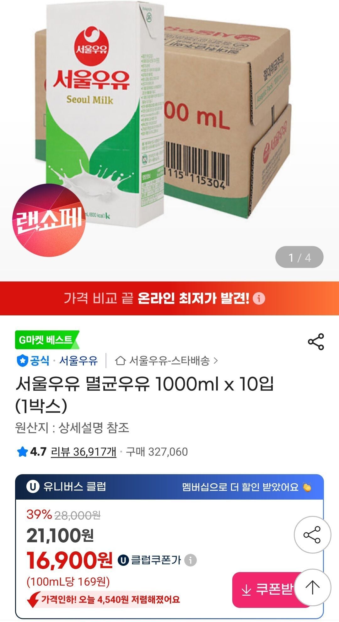 멸균우유 10L 유클쿠폰가 뜨면 살만함 소비기한 7-23