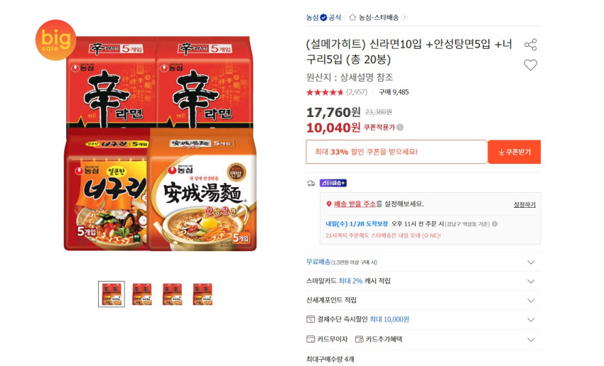 Tổng cộng 20 túi, 10 miếng Shin Ramyun + 5 miếng Neoguri + 5 miếng Anseongtangmyeon