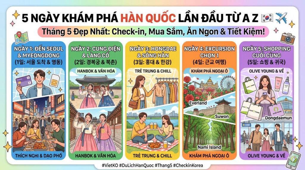 Chào mọi người! 👋 Nếu bạn đang lên kế hoạch cho chuyến đi Hàn Quốc đầu tiên vào tháng 5 này – thời điểm đẹp nhất trong năm, thì đừng bỏ qua lịch trình siêu chi tiết và tối ưu này nhé.