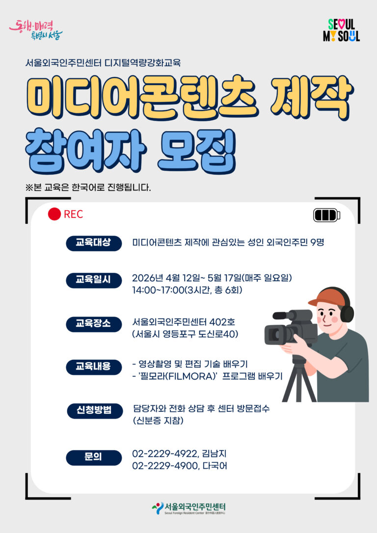 Thông tin chương trình Đối tượng: Người nước ngoài trưởng thành quan tâm đến sản xuất nội dung (9 người) Thời gian: 12/04/2026 ~ 17/05/2026 (Chủ nhật hàng tuần)14:00 ~ 17:00 (3 tiếng, tổng 6 buổi) Địa điểm: Seoul Foreign Resident Center (phòng 402)(서울 영등포구 도신로 40) Nội dung: Học quay video và kỹ năng […]